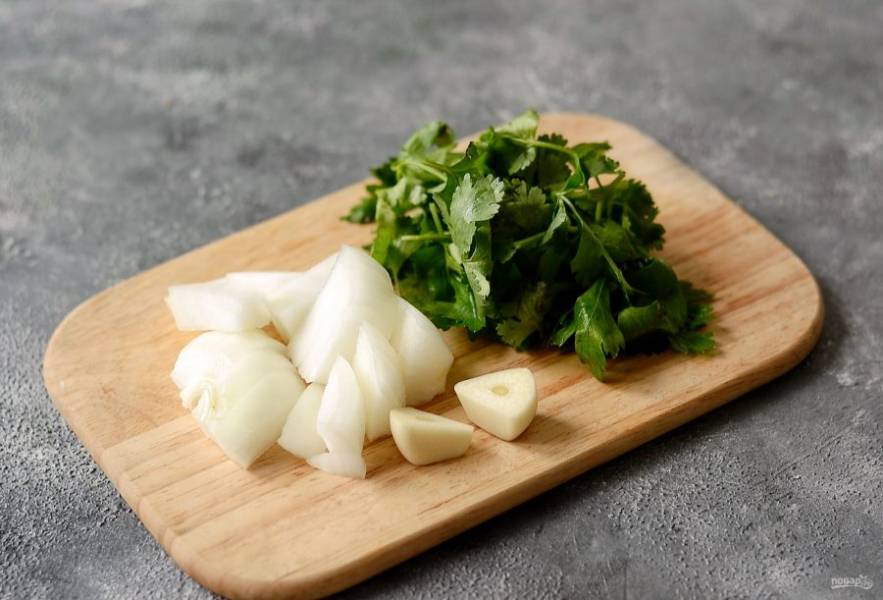 Лук и чеснок очистите, нарежьте на удобные для измельчения кусочки. Зелень крупно порубите.