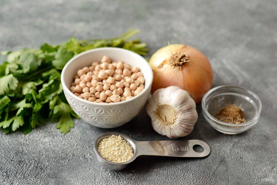 Измельчите нут вместе с репчатым луком, чесноком и зеленью. Добавьте все специи, кунжут и соль, перемешайте.