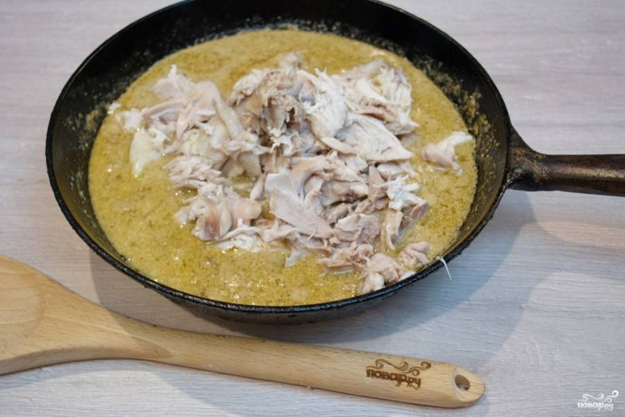 Курицу извлеките из бульона. Разберите руками на небольшие кусочки. Удалите кости. Мясо поместите в соус. Перемешайте.