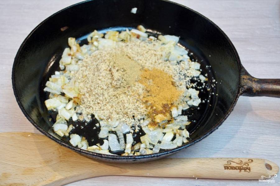 Добавьте к обжаренному луку измельченный орех, специи. Специи кладите по вкусу, но кориандр должен быть обязательно. Некоторые хозяйки в соус сациви добавляют муку. Я предпочитаю этого не делать. Соус загущается отлично за счет использования измельченного ореха.