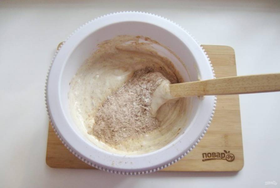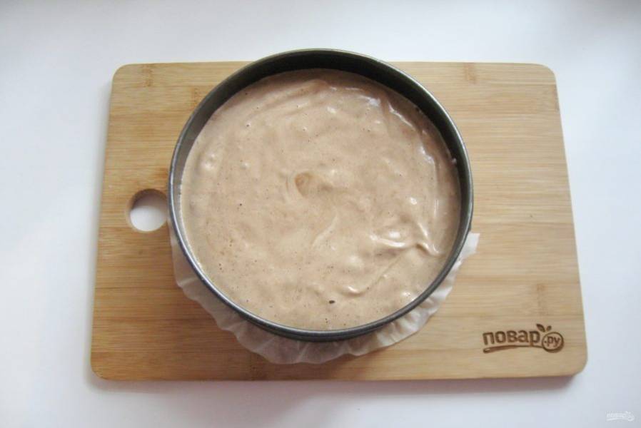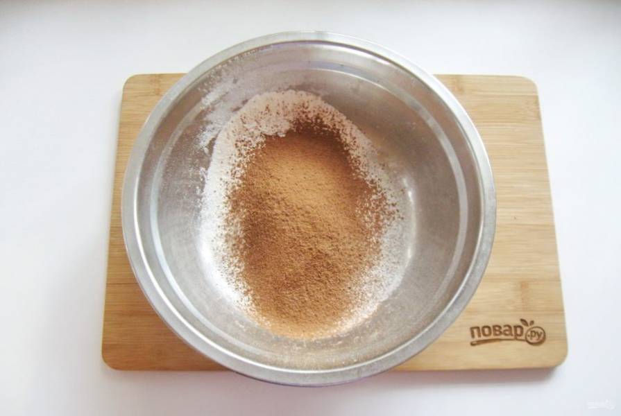 Перемешайте муку с какао-порошком и постепенно всыпьте в яично-сахарную смесь. Добавьте разрыхлитель.