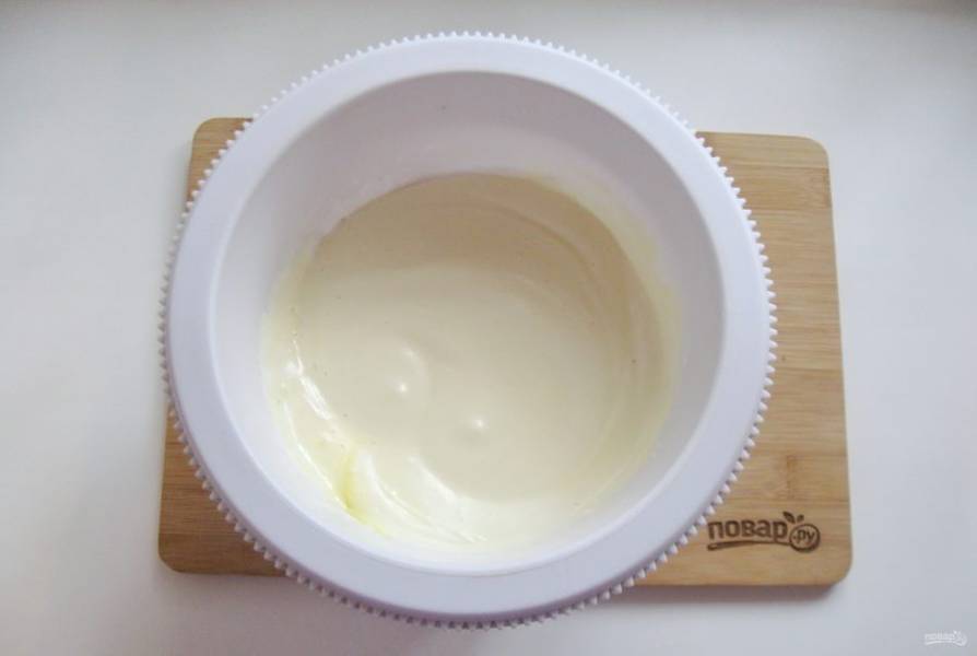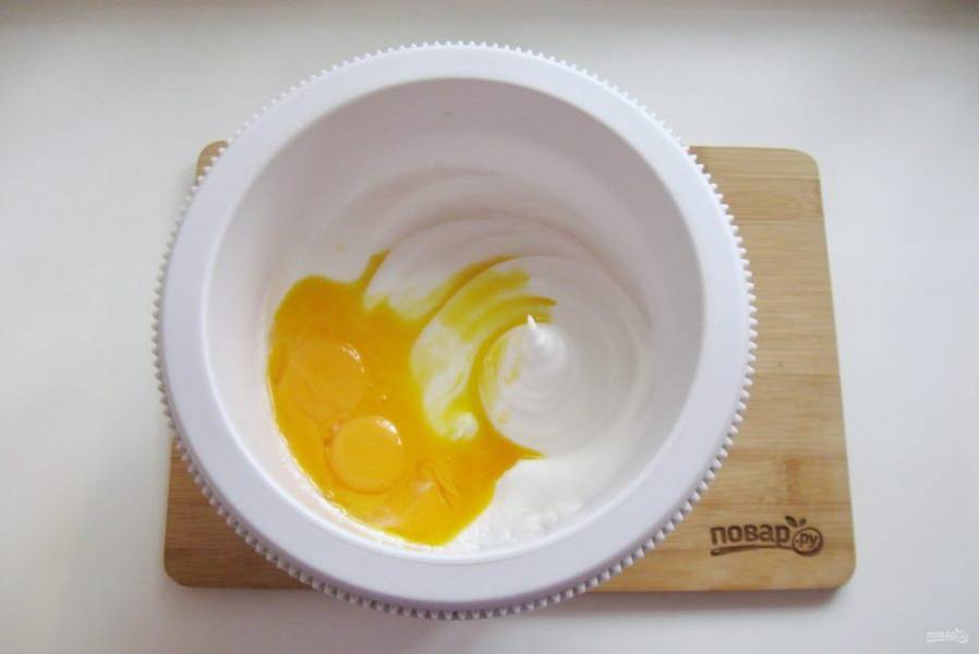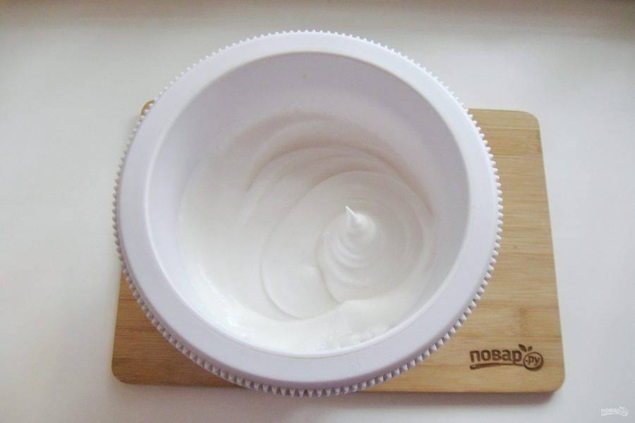 Взбейте белки до мягких пиков, после всыпьте постепенно сахар, не переставая взбивать. Должна получиться плотная, стойкая масса.
