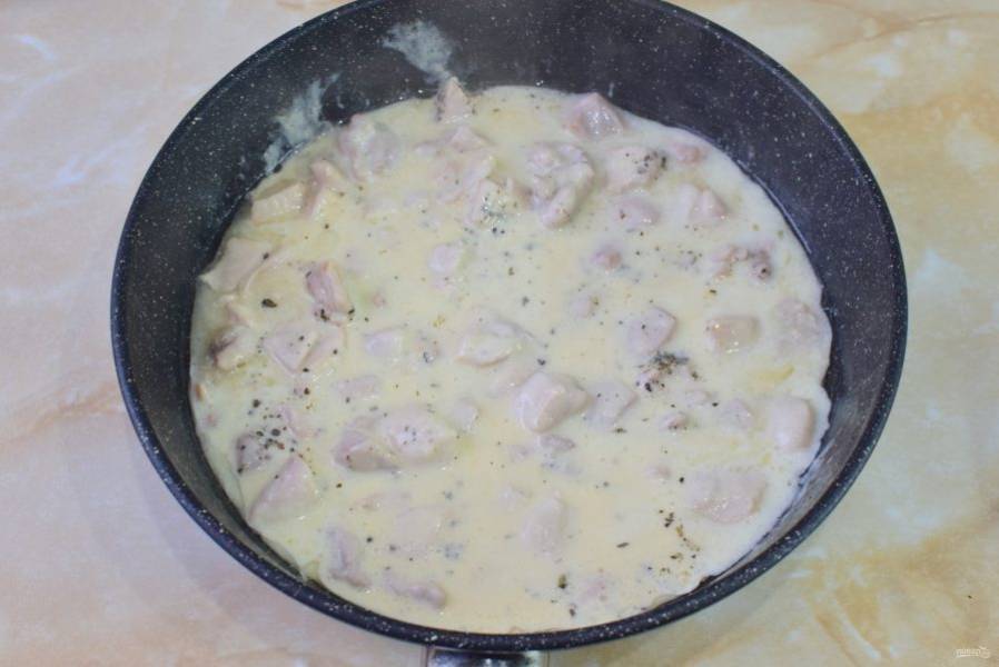 Залейте мясо сливками и смесью с желтком. По вкусу добавьте соль и специи. Доведите все до кипения. Прогрейте 1-2 минуты и снимите с огня.
