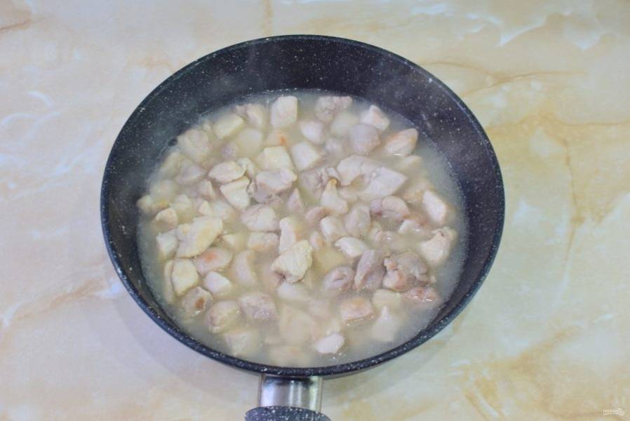 Куриное филе нарежьте небольшими кусочками и обжарьте 4-5 минут. Мясо начнет слегка поджариваться.
