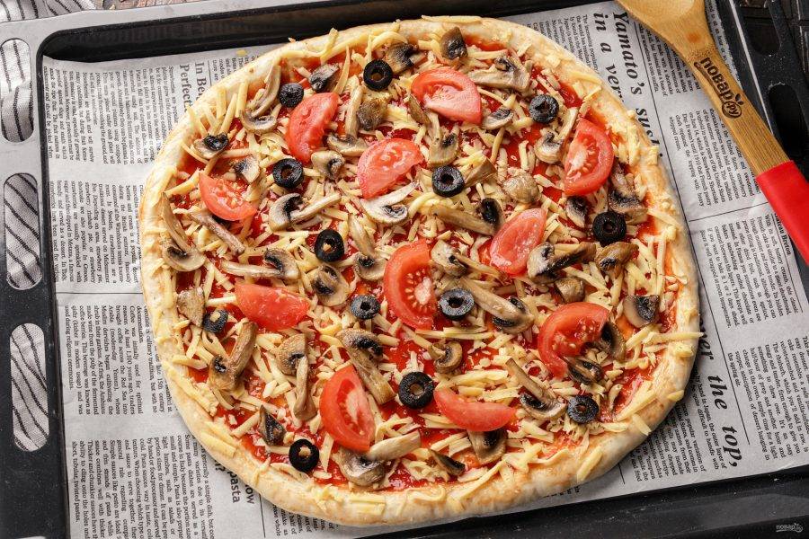 Выложите начинку. У меня грибы, помидоры, сыр и маслины.
