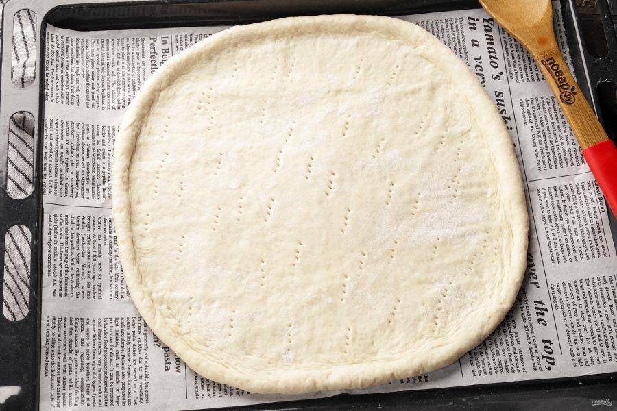 Я обычно раскатываю тесто на силиконизированном пергаменте или специальном коврике для выпечки, присыпанным мукой, на нём же и выпекаю, т.к. очень сложно перенести довольно тонко раскатанное тесто на противень, чтобы оно не деформировалось. Для этого нужна специальная большая лопата для пиццы, как в пиццериях, но у меня её нет. Сформируйте бортики и наколите тесто вилкой.