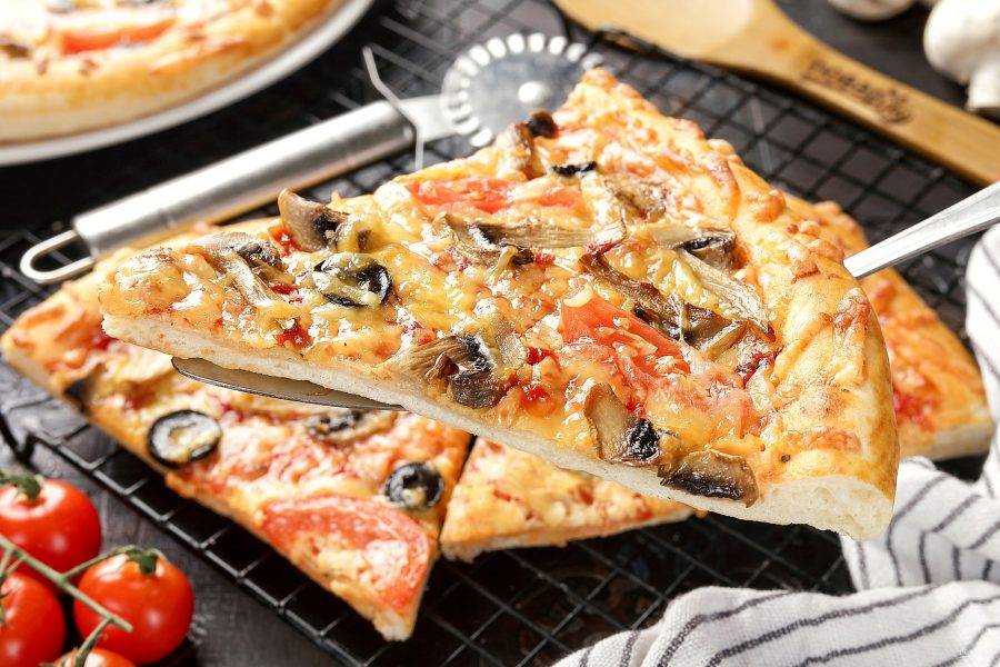 Готовую пиццу нарежьте на порционные кусочки и в горячем виде подавайте на стол.