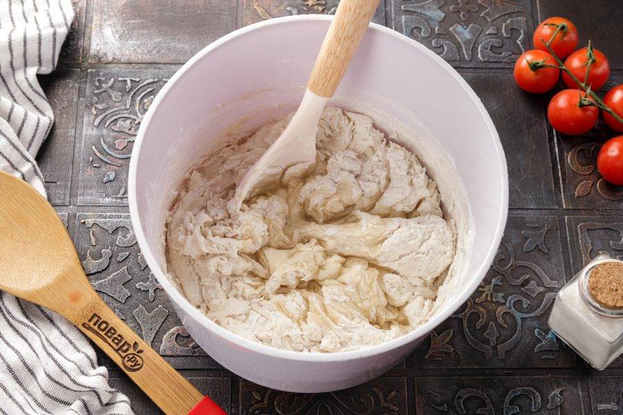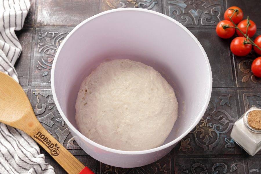 Замесите тесто. Тесто должно быть мягким и чуть липким, но так и должно быть, чтобы пицца получилась сверху хрустящая и внутри нежная. Перед раскаткой просто присыпьте стол мукой или смажьте маслом. Но если тесто сильно липнет к рукам, то можно добавить ещё немного муки, около 1-3 ст.л. Смажьте руки растительным маслом, сформируйте из теста шар, выложите его в миску, накройте полотенцем и дайте подняться в тёплом месте около часа.