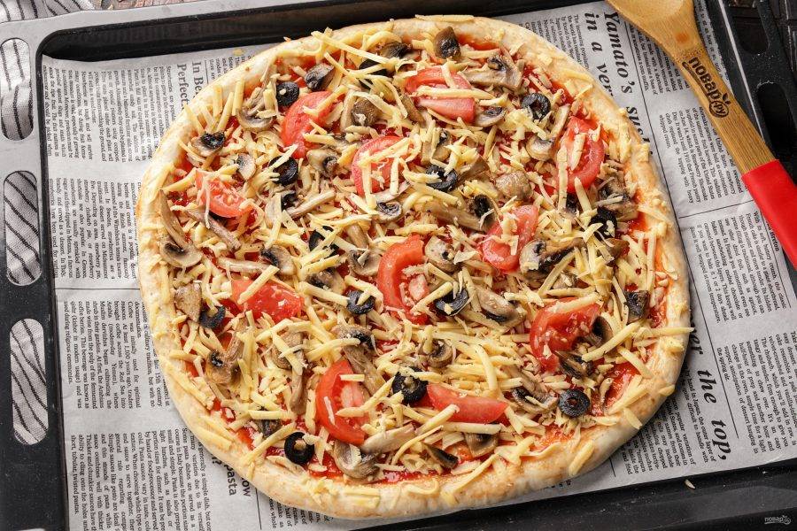 Сверху дополнительно можно присыпать пиццу ещё сыром.