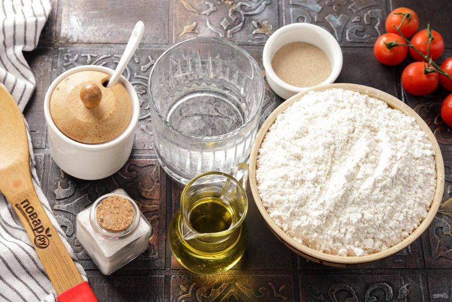 Подготовьте все ингредиенты по списку. Берите чистую питьевую воду, не нужно использовать хлорированную воду из-под крана. Муку берите высшего сорта, и, конечно, лучше использовать оливковое масло, а не подсолнечное.