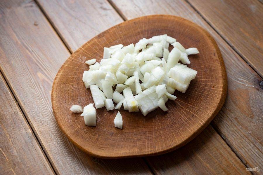 Выложите измельченный лук в сковороду с растительным маслом. Обжаривайте, постоянно помешивая лопаткой, на среднем огне до появления легкого золотистого оттенка.