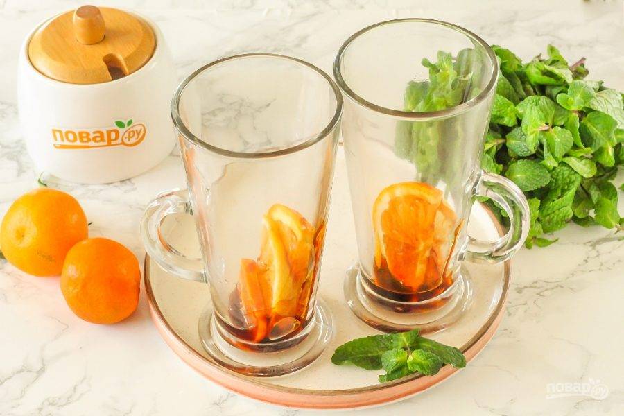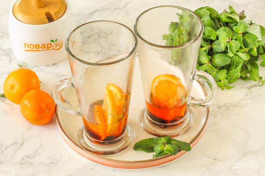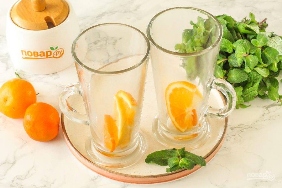 Нарежьте апельсин, лимон и мандарин дольками. Вместо лимона можно использовать лайм. Добавьте по ломтику каждого цитрусового в чашки или стаканы.