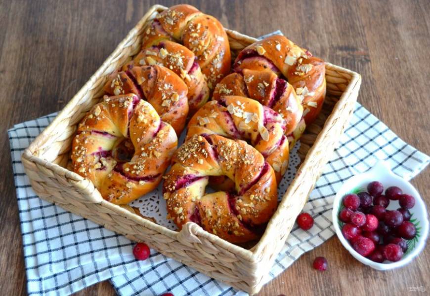 Выпекайте "клюквенные веночки" в духовке, предварительно разогретой до 180 градусов 25-30 минут. Подавайте вкусную и красивую выпечку к чаю или к кофе и наслаждайтесь ароматами и вкусами осени!