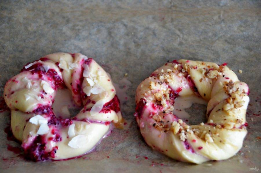 Выложите заготовки на лист для выпечки, дайте "отдохнуть" 15-20 минут. Смажьте смесью яичного желтка с 1 ч.л. молока. Включите на разогрев духовку до 180 градусов.