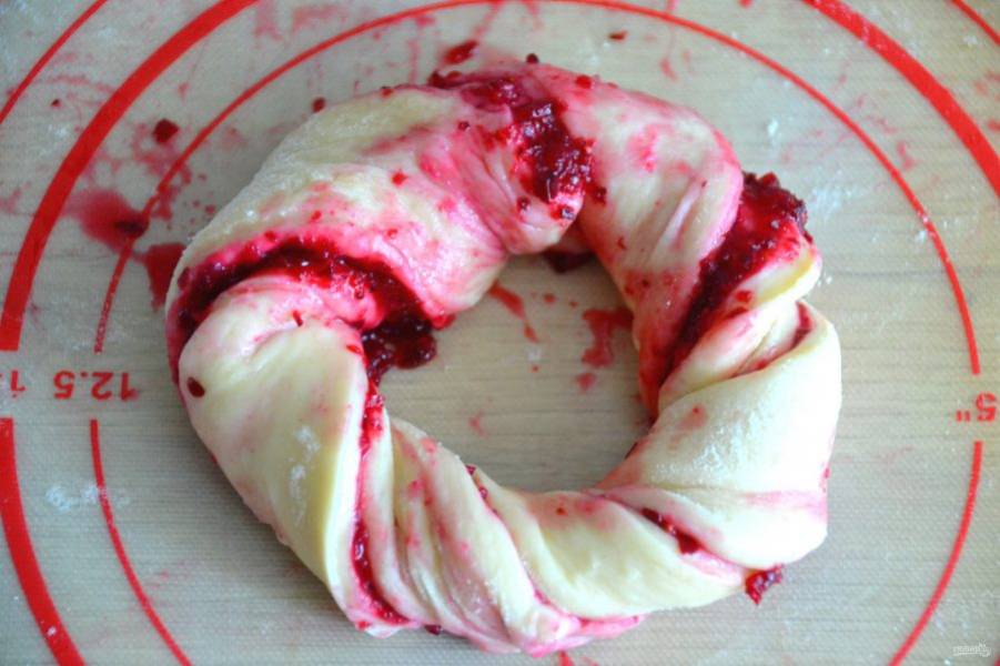 Присыпьте рабочую поверхность стола мукой, выложите тесто, раскатайте в прямоугольный пласт, нанесите равномерно начинку на тесто.