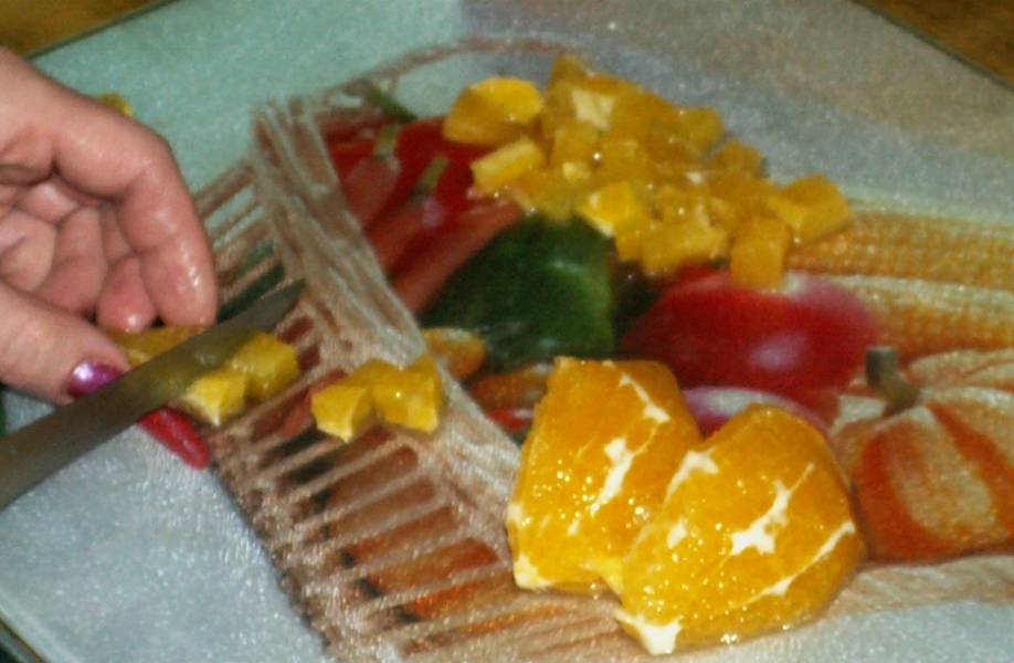 С апельсина срезаем кожуру и нарезаем его небольшими кубиками.