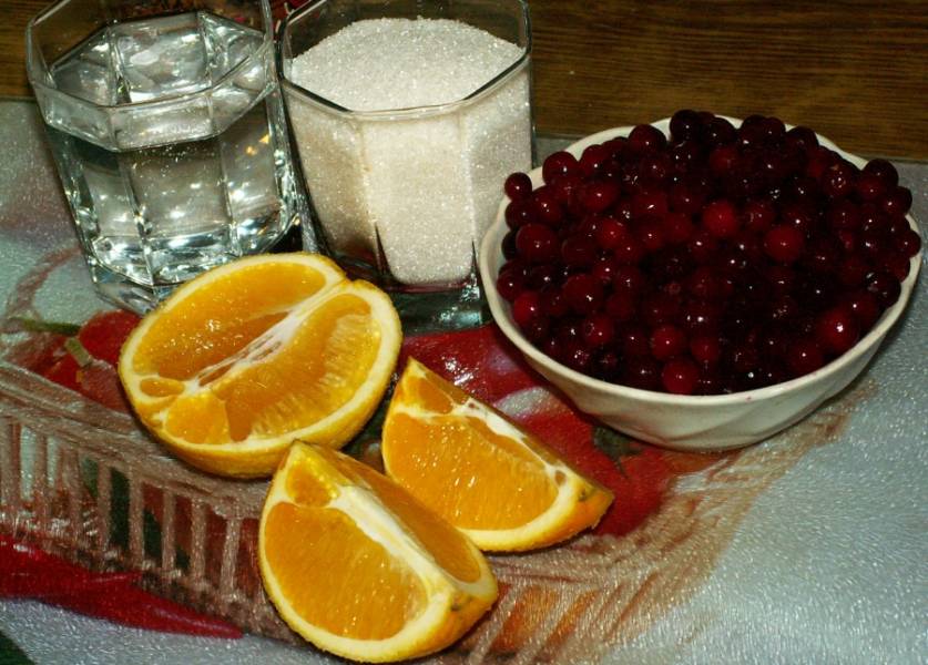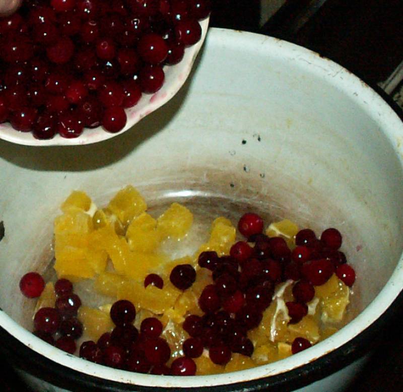 В подготовленную емкость кладем апельсин и клюкву, ставим на медленный огонь.