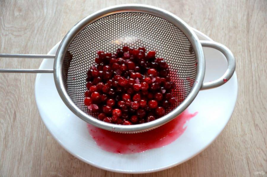 Откиньте клюкву на сито. Сахарный сироп в последующем используйте для приготовления пропитки для торта.