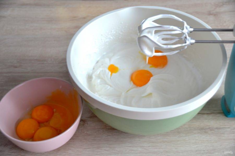 Постепенно введите шесть яичных желтков в белковую массу, продолжая взбивать.