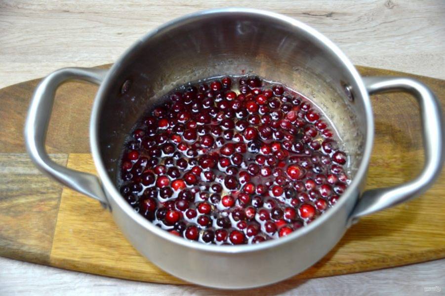 Приготовьте насыщенный сахарный сироп из сахара и воды. Когда сироп немного остынет, выложите в него клюкву, оставьте на несколько часов.