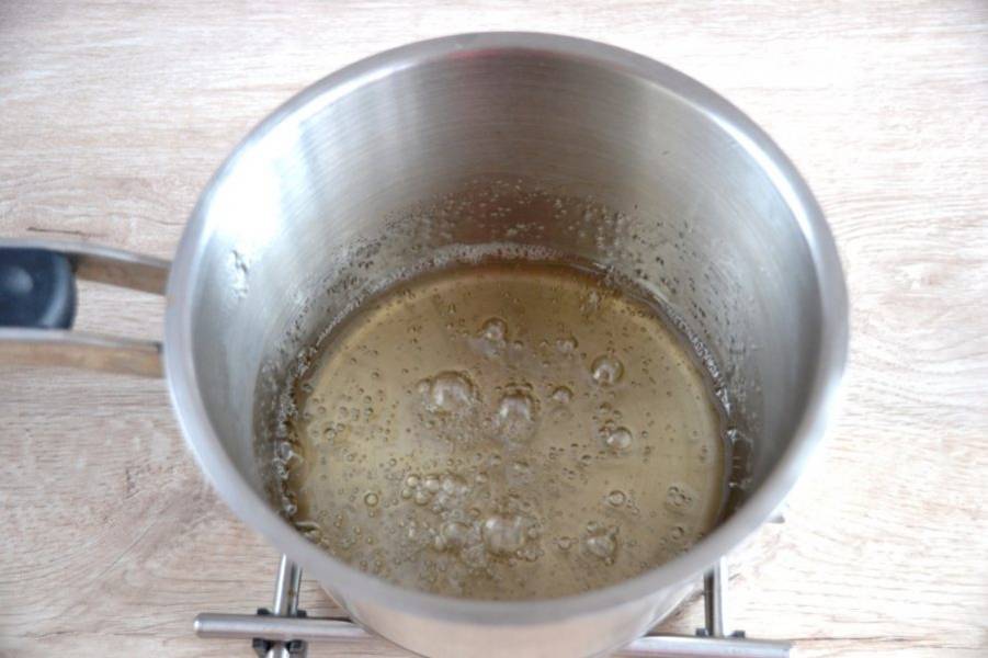 Всыпьте 180 грамм сахара в сотейник, добавьте 45 мл. воды. Приготовьте сироп, мешать в процессе нагревания не следует, лишь только покачивайте сотейник из стороны в сторону. Нагрейте до 118 градусов, если нет специального термометра, то варите сироп три минуты с момента закипания.