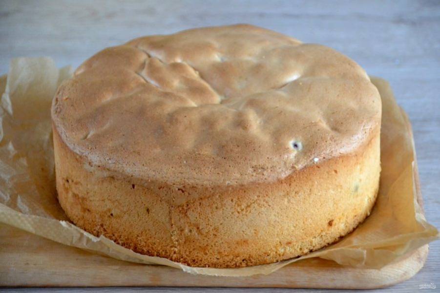 Извлеките готовый бисквит из формы, охладите. В идеале завернуть в пищевую пленку и дать ему "отдохнуть" до 6 часов.