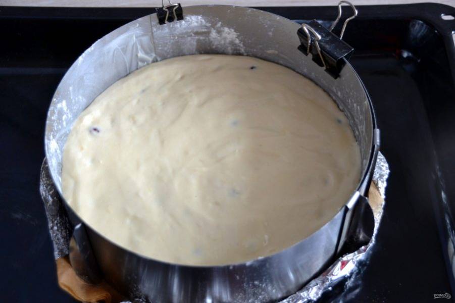 Подготовьте разъемную форму диаметром 22-23 см., смажьте сливочным маслом, присыпьте мукой, излишки муки стряхните. Выложите тесто, выпекайте 40 минут при температуре 180 градусов, готовность проверяйте деревянной шпажкой.
