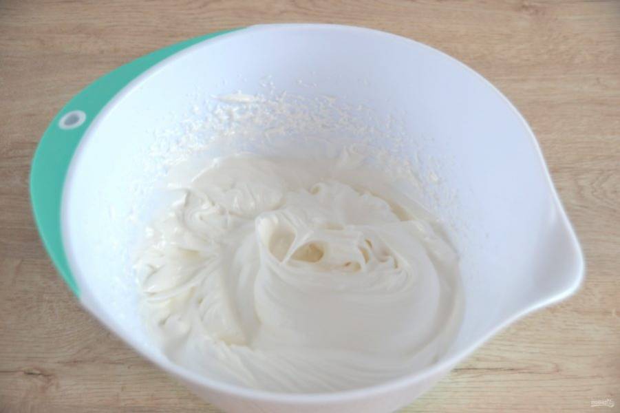Приготовьте белковый крем, для этого взбейте три яичных белка с чайной ложкой лимонного сока в пышную пену.