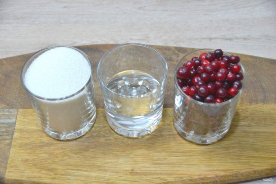 Заранее приготовьте засахаренные ягоды, для этого вам понадобится 150 грамм сахара, 100 мл. воды, стакан клюквы.