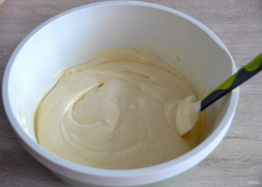 Введите мучную смесь к яичной смеси, аккуратно перемешайте до однородной консистенции движением силиконовой лопаточки снизу вверх.