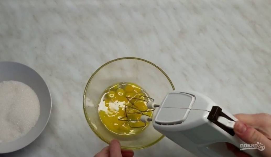 1. С помощью миксера перебейте яйца вместе с сахаром, постепенно добавляя его в яичную массу. Когда смесь увеличится в объеме и побелеет, перелейте ее в кастрюлю.