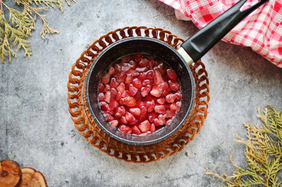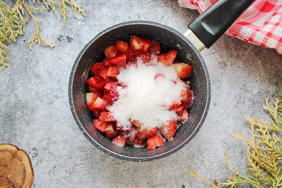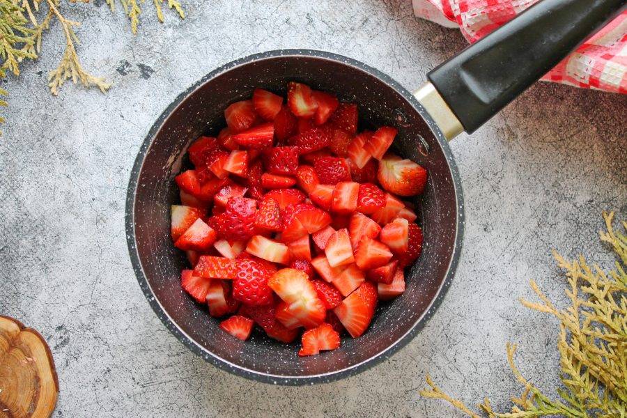 У клубники отрежьте хвостики. Порежьте ягоды кубиком. Выложите ягоды в сотейник с толстым дном.