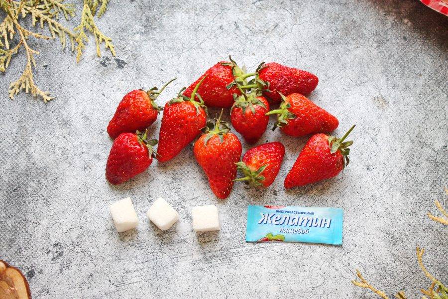 Подготовьте все необходимые ингредиенты для приготовления компоте из клубники для торта. Ягоды переберите, сполосните и дайте им обсохнуть. Желатин залейте холодной, кипяченой водой и дайте набухнуть в течение 45-60 минут, согласно инструкции.