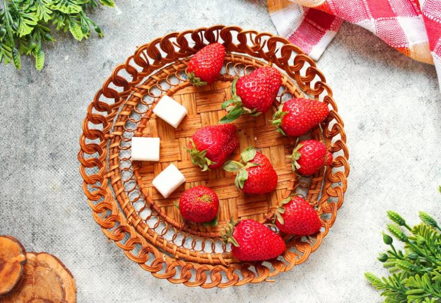 Клубнику переберите, удалите порченные и мятые. Вымойте ягоды, откиньте на сито и дайте воде полностью стечь. Разложите на полотенце и дайте обсохнуть.