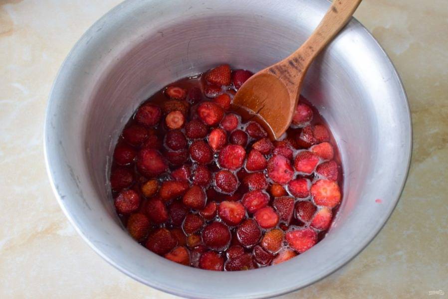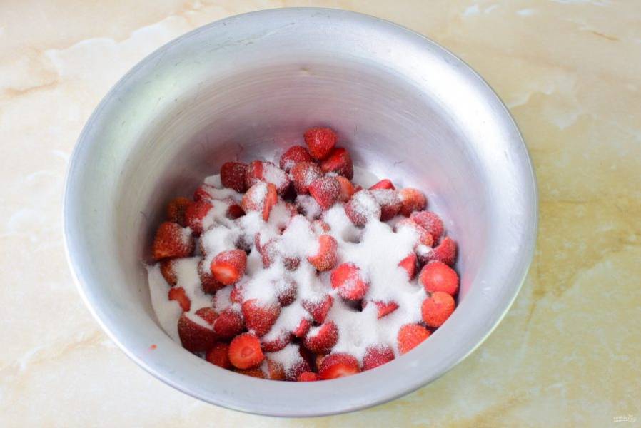 Засыпьте ягоды сахаром и оставьте постоять на несколько часов, чтобы появился сок.