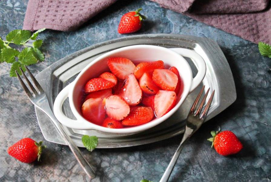 У клубники удалите хвостики и нарежьте на части. Выложите части ягод в жаропрочную форму, добавьте сироп, перемешайте и дайте постоять 1-2 минуты.