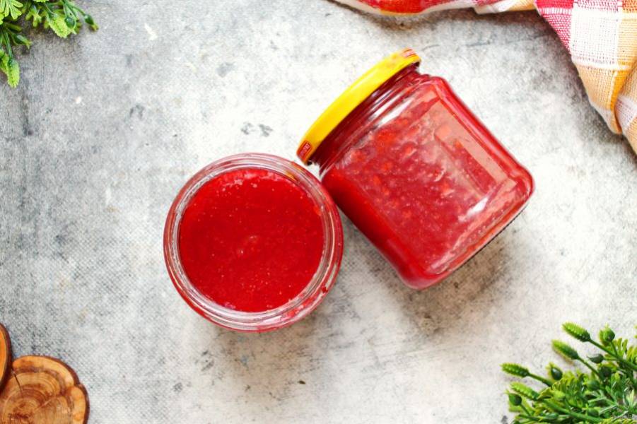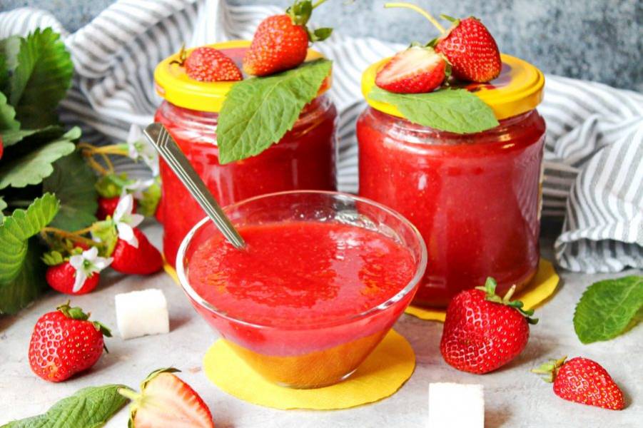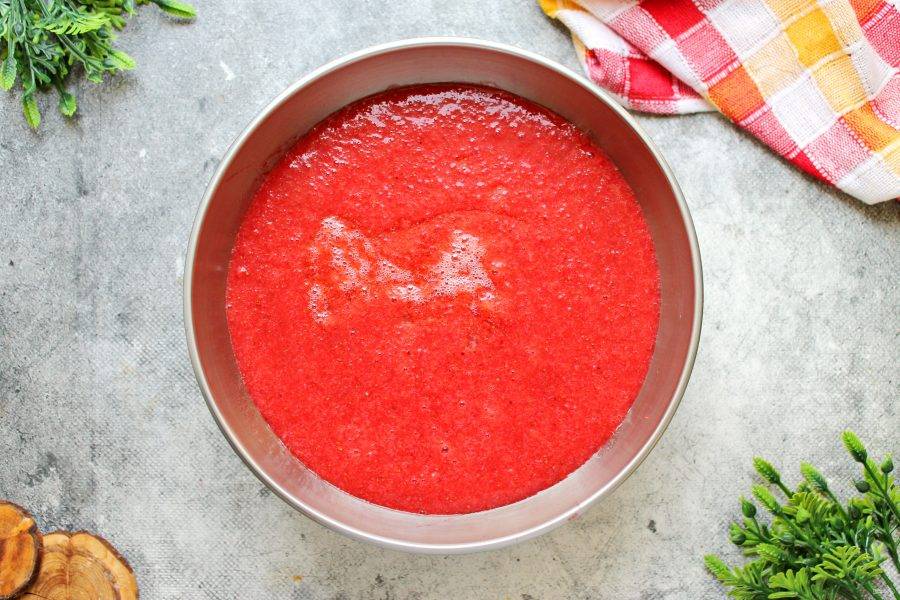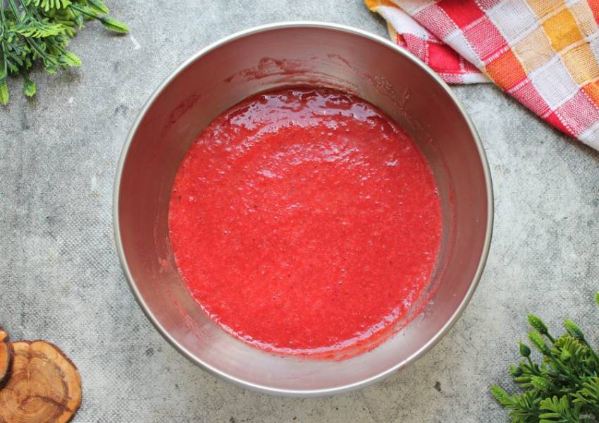 Перелейте сироп в клубничное пюре и перемешайте. Поставьте клубнику, протертую в сиропе на медленный огонь и доведите до кипения. Проварите все в течение 1-2 минуты.