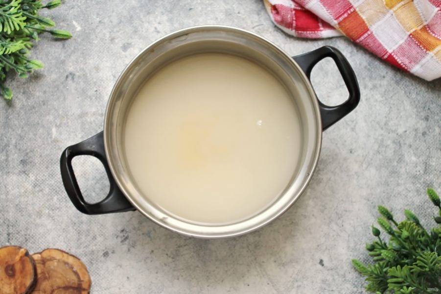 В кастрюлю налейте воду и добавьте сахар, перемешайте. Поставьте кастрюлю на медленный огонь и, мешая, доведите до кипения.