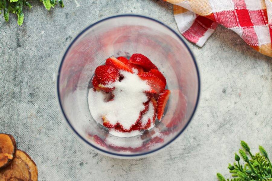 Переложите ягоды в блендер и добавьте сахар.