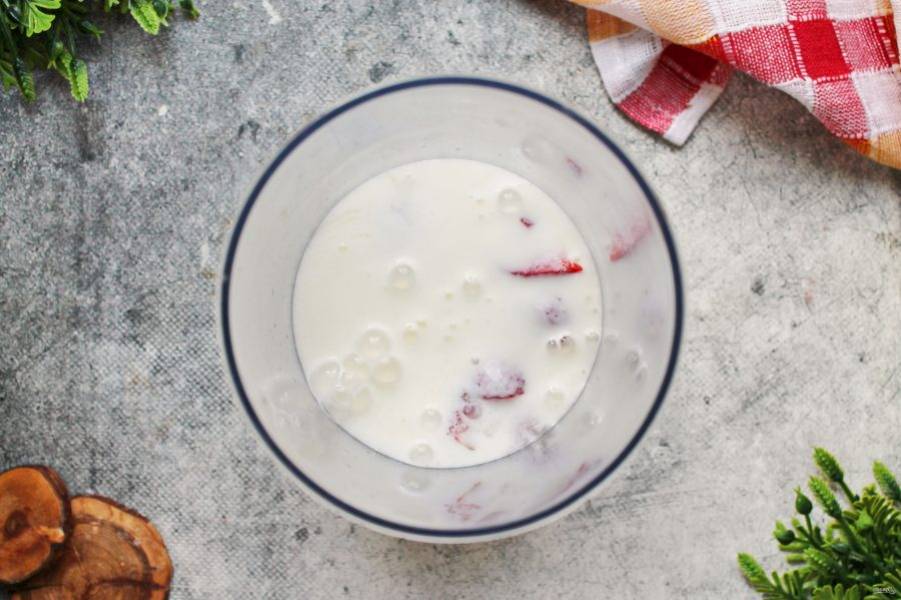 Влейте в чашу с клубникой кефир.