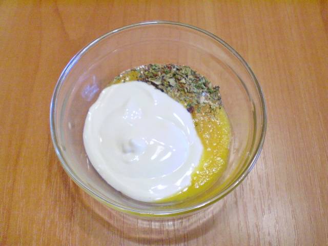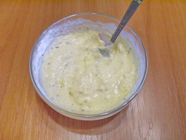 8. Кляр из сметаны готов. Густая и воздушная масса прекрасно сочетается с рыбными, мясными или овощными заготовками для жарки.
