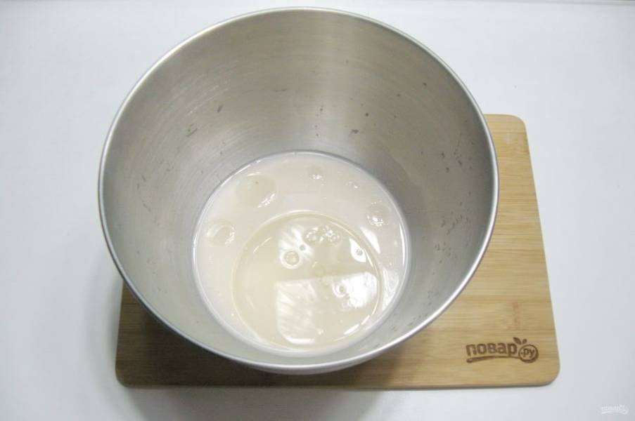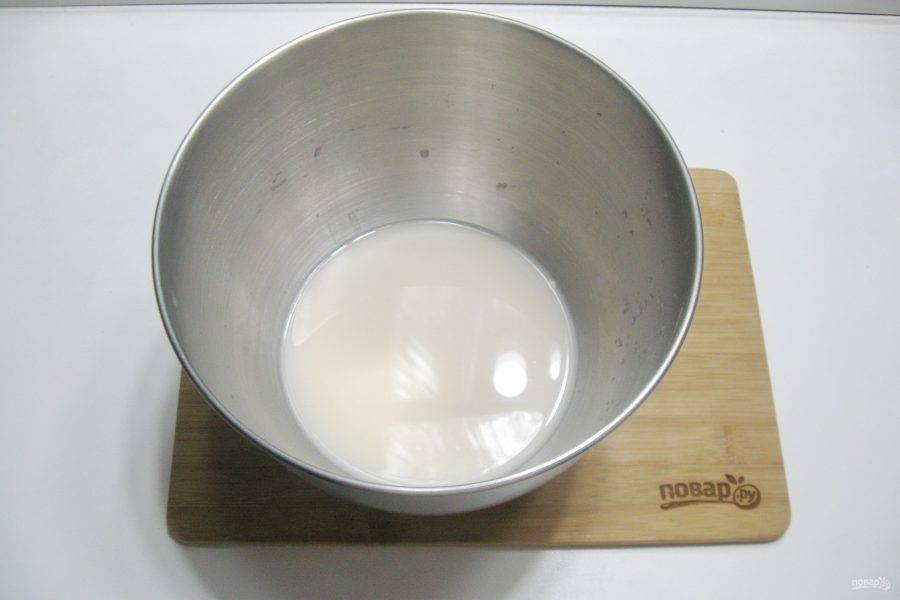 Теплую воду налейте в миску и добавьте дрожжи, перемешайте.