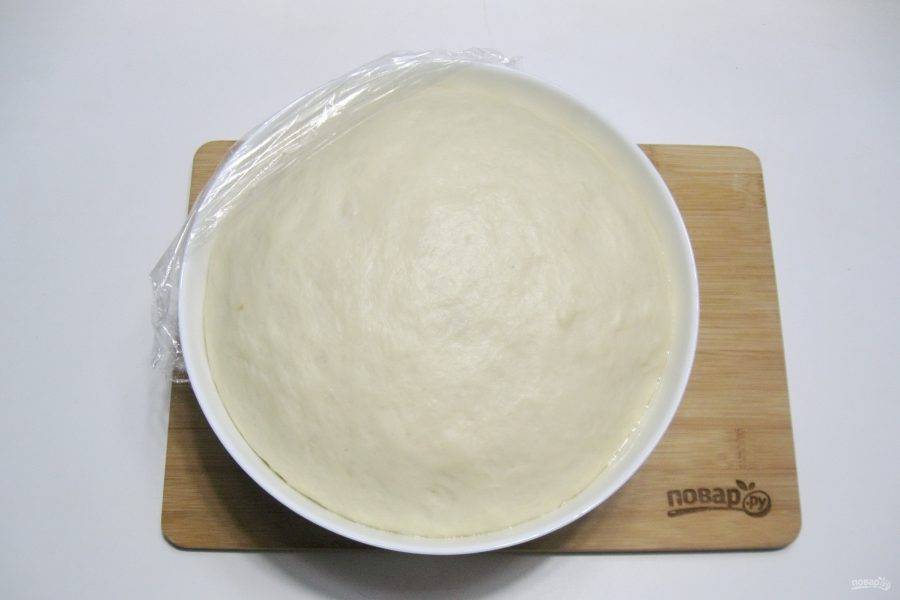 Накройте тесто пищевой пленкой и поставьте в теплое место. Через час-полтора оно подойдет.