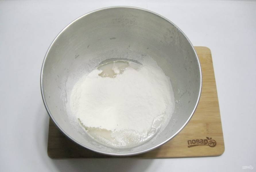Добавьте соль, сахар и просеянную муку.
