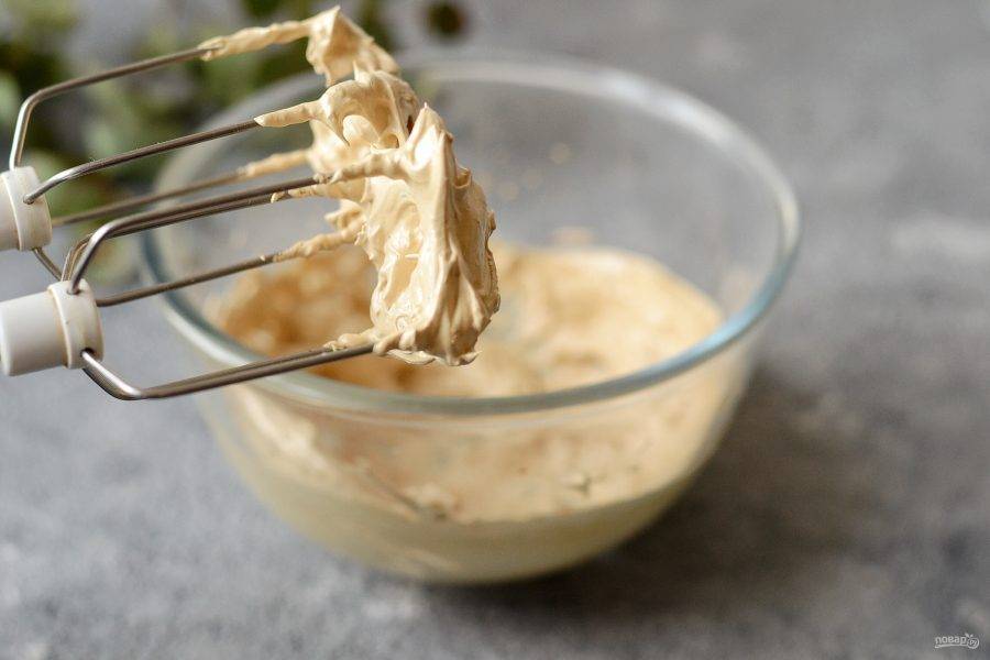 Добавьте воду и взбейте миксером до крепкой пенки.