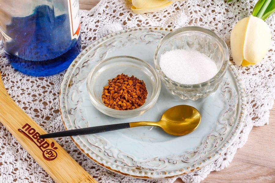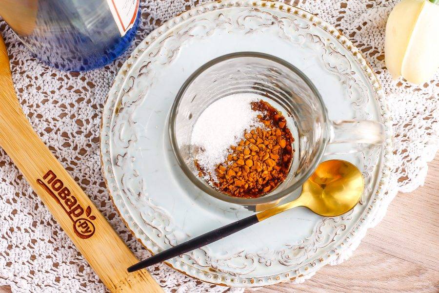 Всыпьте в чашку кофе и сахар либо сварите молотый, добавляя такие же пропорции сахара и воды.