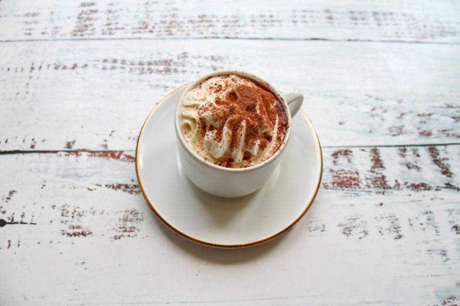 Украсьте готовый кофе взбитыми сливками, посыпьте какао и подавайте.