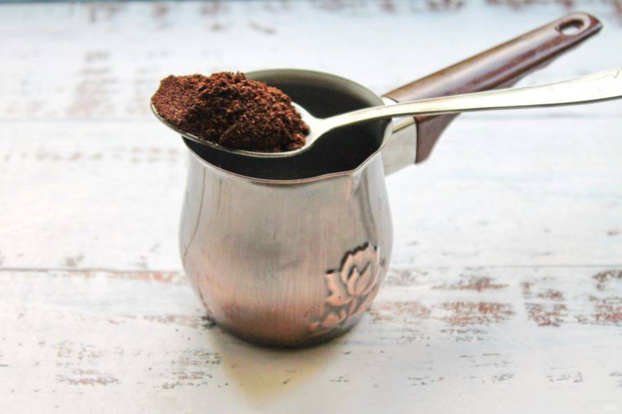 В турку выложите свежемолотый кофе, залейте водой и сварите крепкий кофе.