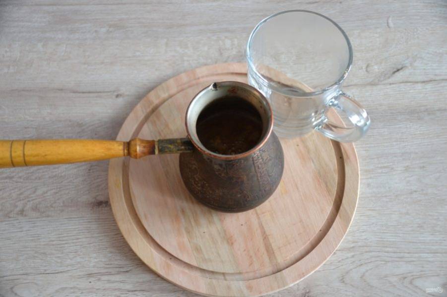 Отлейте половину нагретой горячей воды, всыпьте молотый кофе. Снова поставьте турку на плиту.