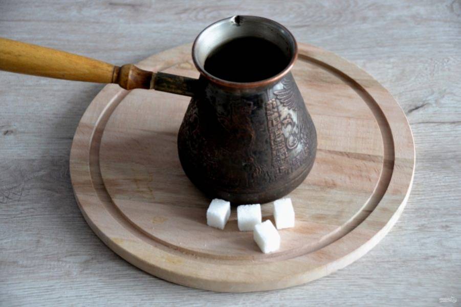 Влейте в турку воду, добавьте сахар, нагрейте до кипения.